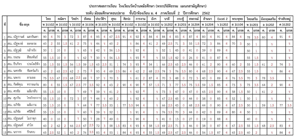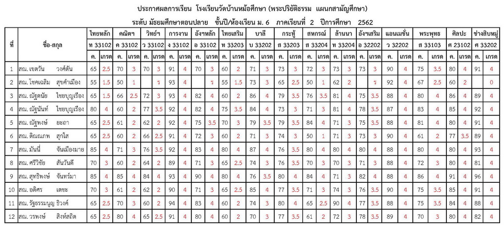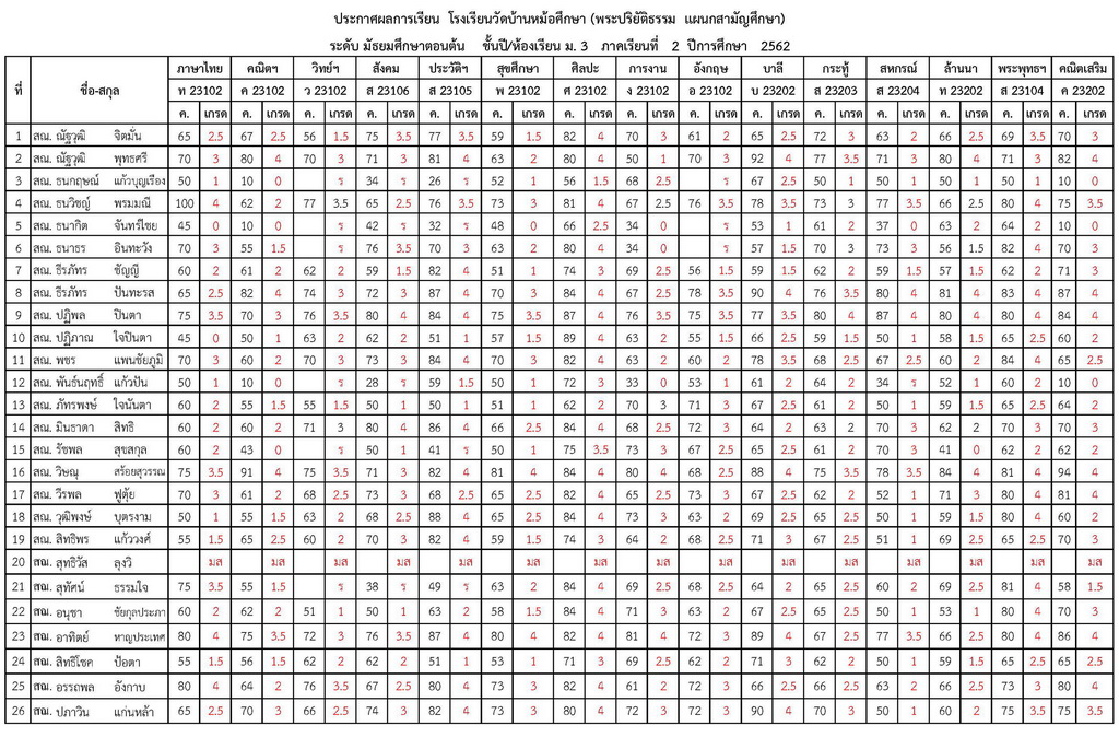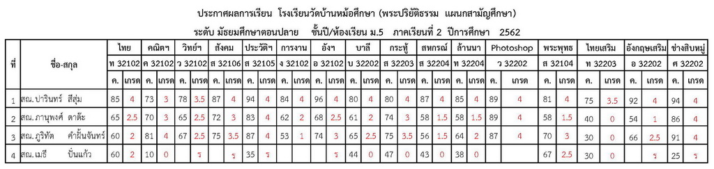 ประกาศผลสอบภาคเรียนที่ 2 ปีการศึกษา 62